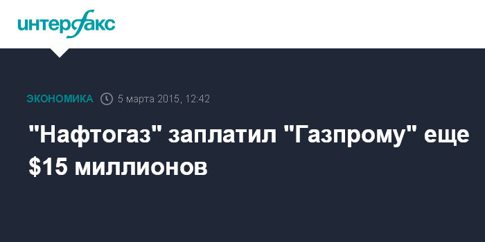 Официальный представитель "Газпрома" Сергей Куприянов сообщил журналистам: "Нафтогаз перечислил $15 млн в качестве предоплаты поставок в марте. Сегодня деньги поступили на расчетный счет "Газпрома". Этой суммы хватает на 45,6 млн куб. м газа, то есть ещё примерно на 5 дней при текущих объемах поставок по заявкам Нафтогаза".