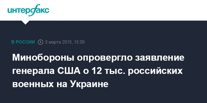 Москва. 5 марта. INTERFAX.RU - В Минобороны России опровергли заявление командующего Сухопутными войсками США в Европе генерала Бена Ходжеса о том, что, по оценкам американских военных, на Украине находятся до 12 тысяч российских военнослужащих.