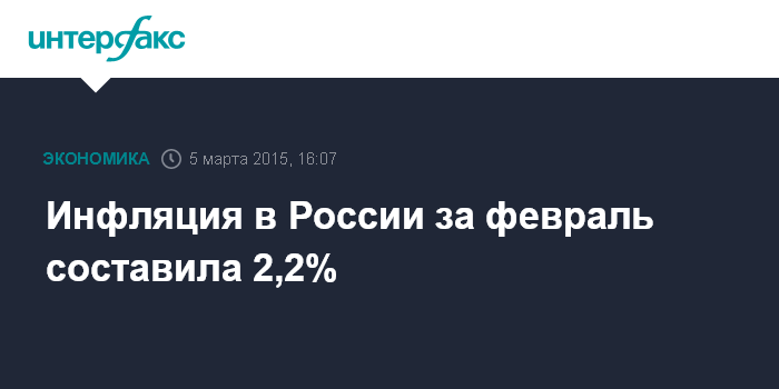 Москва. 5 марта. INTERFAX.RU – Инфляция в России в феврале 2015 года составила 2,2% после 3,9% в январе и 2,6% в декабре 2014 года, сообщил в четверг Росстат. В годовом выражении инфляция в феврале выросла до 16,7%