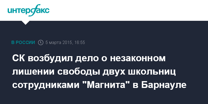 Москва. 5 марта. INTERFAX.RU - Следственный отдел СК по Алтайскому краю возбудил уголовное дело по факту незаконного лишения свободы (ч. 2 ст. 127 УК РФ) двух несовершеннолетних девочек сотрудниками магазина торговой сети "Магнит" в городе Барнауле.