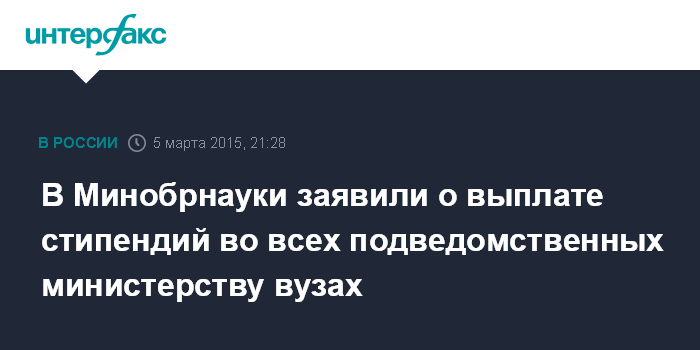 Москва. 5 марта. INTERFAX.RU - Все студенты подведомственных Минобрнауки РФ вузов получили стипендии в срок, заявила пресс-секретарь министра образования и науки Дмитрия Ливанова Анна Усачева.