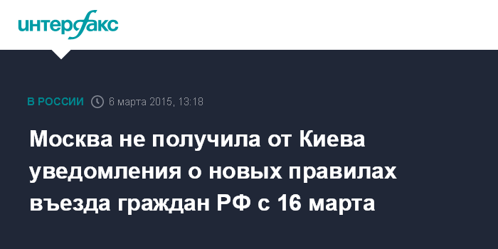Москва. 6 марта. INTERFAX.RU - Никаких официальных уведомлений со стороны Киева о введении для граждан РФ новых правил въезда на территорию страны с 16 марта, в частности о пересечении границы только через международные и межгосударственные пункты пропуска, в российский МИД не поступало, заявил дипломатический источник в пятницу.