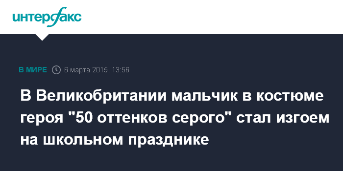 Москва. 6 марта. INTERFAX.RU - В Манчестере мальчику в костюме главного героя эротической книги "50 оттенков серого" не разрешили участвовать в некоторых мероприятиях на школьном празднике, сообщает BBC News.