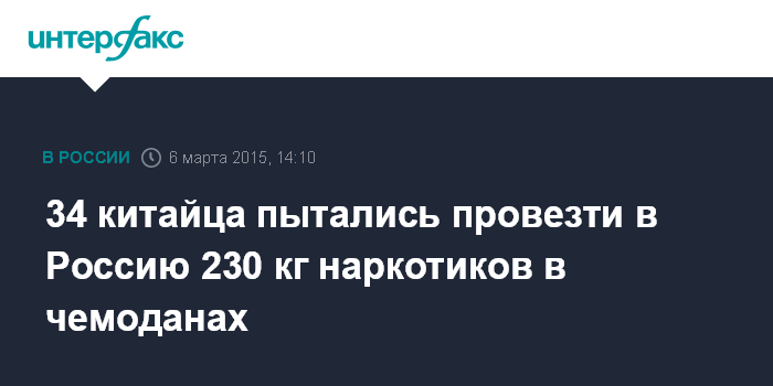 "Сотрудники Шереметьевской таможни перекрыли крупный канал поставок наркотических средств из Китая. 6 марта при проведении таможенного контроля пассажиров, прибывших рейсом Пекин - Москва, сотрудники таможни задержали 34 граждан Китая, которые пытались ввезти на территорию России 230 килограммов метамфетамина", - говорится в сообщении ФТС.