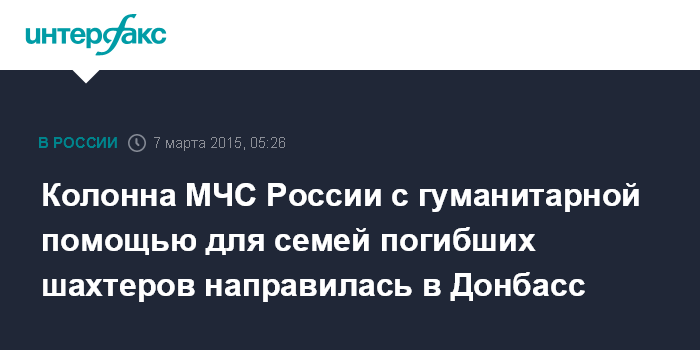 Москва. 7 марта. INTERFAX.RU - МЧС России направило внеочередную колонну с гуманитарной помощью в Донецк, она предназначена для семей шахтеров, погибших и пострадавших в результате аварии на шахте имени Засядько, а также для жителей города, сообщили в Национальном центре управления в кризисных ситуациях МЧС России.