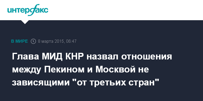 Москва. 8 марта. INTERFAX.RU - Китайско-российские отношения не зависят от желаний третьих стран и развиваются стабильно. Об этом на встрече с журналистами в рамках сессии Всекитайского собрания народных представителей (ВСНП, высший орган государственной власти Китая - ИФ) заявил министр иностранных дел КНР Ван И.