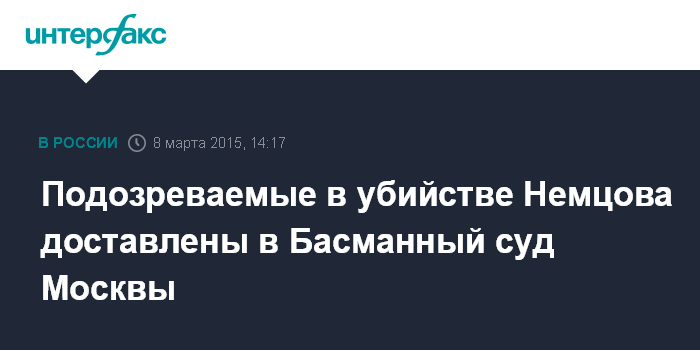 Москва. 8 марта. INTERFAX.RU - Подозреваемые в убийстве политика Бориса Немцова доставлены в суд, где будет рассмотрено ходатайство следствия об их аресте. "Да, есть доставка", - сообщила "Интерфаксу" в воскресенье утром пресс-секретарь Басманного суда Анна Фадеева.