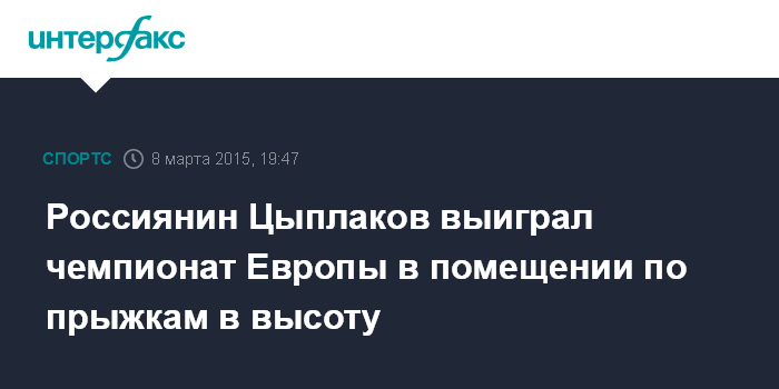 Москва. 8 марта. INTERFAX.RU - Россиянин Даниил Цыплаков завоевал золотую медаль в прыжках в высоту на чемпионате Европы в помещении.