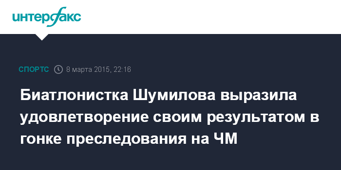 Москва. 8 марта. INTERFAX.RU - Российская биатлонистка Екатерина Шумилова выразила удовлетворение своим результатом, достигнутым в гонке преследования на проходящем в финском Контиолахти чемпионате мира .