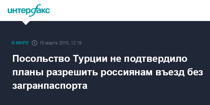 Москва. 10 марта. INTERFAX.RU - Посольство Турции в России не располагает официальным подтверждением того, что россиянам могут разрешить въезд в страну по внутренним паспортам РФ, сообщили "Интерфаксу" в отделе культуры и туризма посольства во вторник.