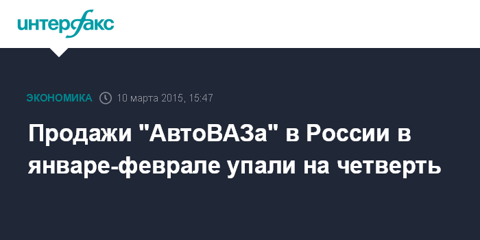 Москва. 10 марта. INTERFAX.RU – "АвтоВАЗ" снизил продажи автомобилей Ladaв России в феврале 2015 года на 23%, до 23,639 тыс. автомобилей, говорится в сообщении Ассоциации европейского бизнеса.