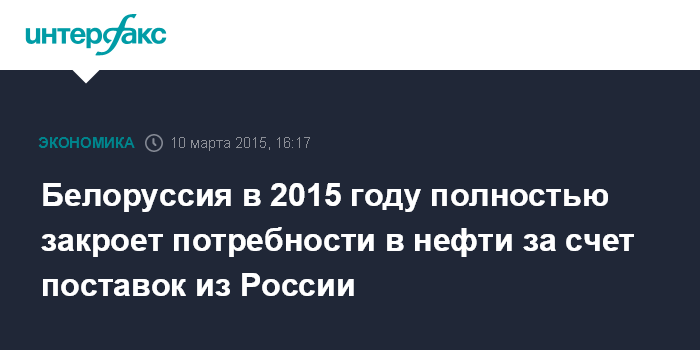 Москва. 10 марта. INTERFAX.RU – Белоруссия полностью закроет потребности в нефти за счет российских поставок, заявил заместитель премьер-министра Владимир Семашко журналистам во вторник в Минске.