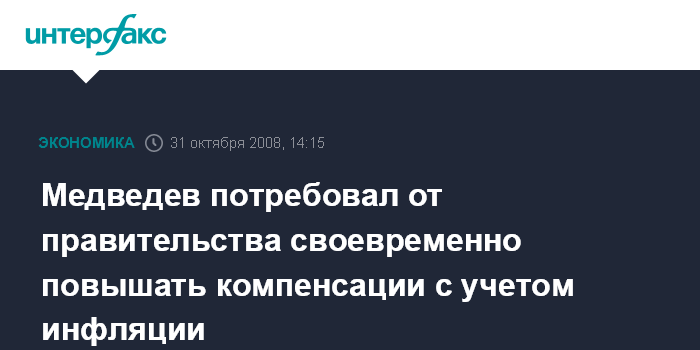 Москва. 31 октября. INTERFAX.RU - Правительство должно своевременно увеличивать компенсационные выплаты, основываясь на реальных темпах инфляции, заявил президент России Дмитрий Медведев. "Мы понимаем, что все финансовые проблемы, которые сегодня существуют, они создают ряд дополнительных непредвиденных эффектов, таких как увеличение темпов инфляции. Правительство должно следить за тем, чтобы компенсации происходили на основе реальных темпов инфляции, которые достигнуты в текущий период", - сказал Медведев на встрече с главой Минздравсоцразвития Татьяной Голиковой.