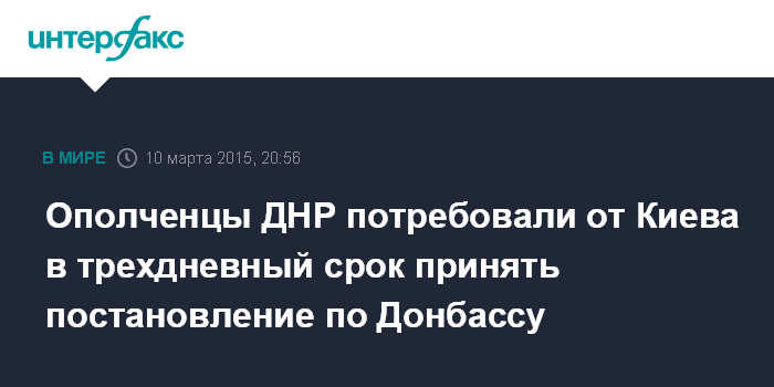 Москва. 10 марта. INTERFAX.RU - В самопровозглашенной Донецкой народной республике предупредили о возможном срыве реализации ряда минских договоренностей, если Киев не уложится в трехдневный срок с определением перечня районов Донбасса, наделяемых особым статусом.