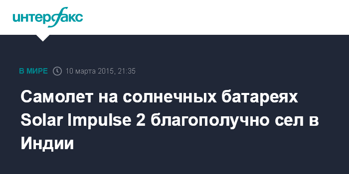 Москва. 10 марта. INTERFAX.RU – Швейцарский самолет на солнечных батареях Solar Impulse 2, пытающийся совершить кругосветное путешествие только с помощью энергии солнца, прибыл во вторник из Омана в индийский город Ахмедабад, сообщает команда проекта в своем твиттере.