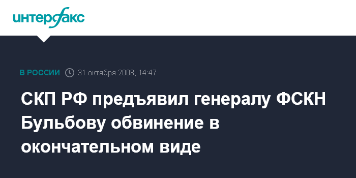 Москва. 31 октября. INTERFAX.RU - Следственный комитет при прокуратуре (СКП) РФ предъявил обвинения в окончательной редакции руководителю департамента оперативного обеспечения Федеральной службы по контролю за оборотом наркотиков генерал-лейтенанту полиции Александру Бульбову.