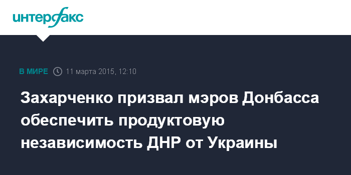 Москва. 11 марта. INTERFAX.RU - Глава самопровозглашенной Донецкой народной республики Александр Захарченко поручил главам городов обеспечить рынок собственной продукцией.