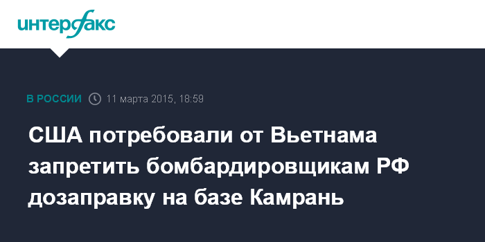 Москва. 11 марта. INTERFAX.RU - США обратились к Вьетнаму с просьбой запретить России использовать бывшую базу США в городе Камрань для дозаправки бомбардировщиков, способных нести ядерный боезаряд, сообщает в среду британская газета Daily mail со ссылкой на представителя Госдепа.