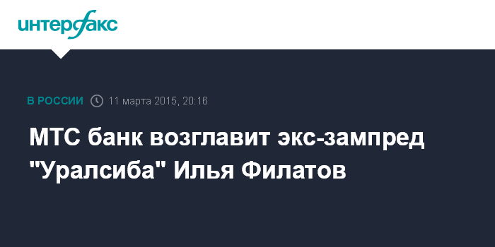Москва. 11 марта. INTERFAX.RU - Совет директоров МТС банка назначил на должность председателя правления бывшего зампреда правления банка "Уралсиб" Илью Филатова, говорится в сообщении МТС банка на сайте раскрытия информации.