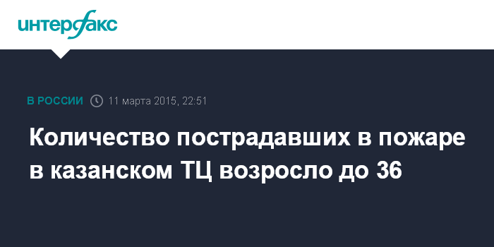 Москва. 11 марта. INTERFAX.RU - В результате пожара в торговом центре "Адмирал" в Казани, по уточненным данным, четыре человека погибли, 36 пострадали, сообщает ГУ МЧС по Татарстану.