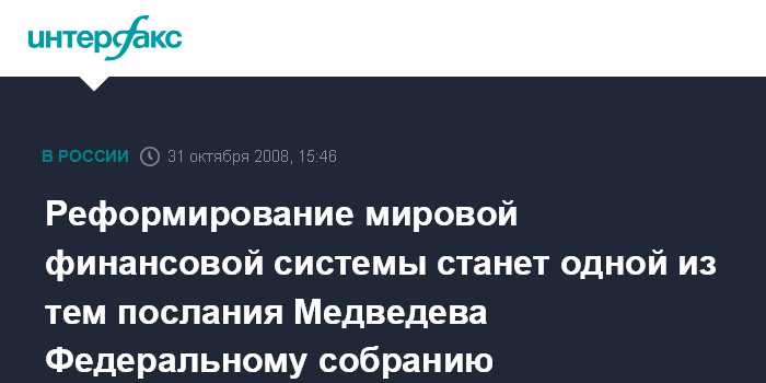 Москва. 31 октября. INTERFAX.RU - Президент РФ Дмитрий Медведев сообщил, что реформирование мировой финансовой системы станет одной из тем его послания Федеральному собранию, которое будет оглашено 5 ноября.