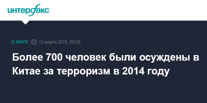 Москва. 12 марта. INTERFAX.RU - За террористическую и сепаратистскую деятельность в 2014 году в Китае были осуждены 712 человек, сообщил председатель Верховного народного суда (ВНС) КНР Чжоу Цян.
