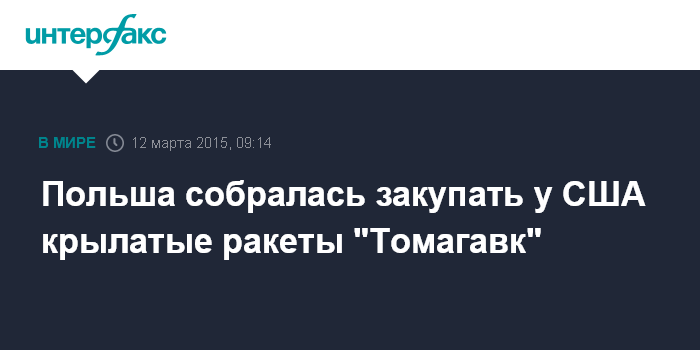 Москва. 12 марта. INTERFAX.RU - Министерство национальной обороны Польши обратилось к госдепартаменту США с просьбой рассмотреть возможность продажи Варшаве крылатых ракет "Томагавк", сообщает польская "Газета правна".