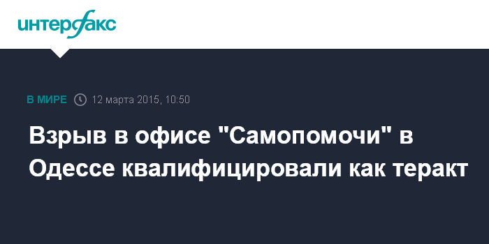 Москва. 12 марта. INTERFAX.RU - Милиция квалифицирует ночной взрыв в Одессе в офисе политической партии "Объединение "Самопомич" как террористический акт.