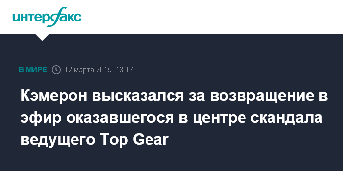 Москва. 12 марта. INTERFAX.RU - Премьер-министр Великобритании Дэвид Кэмерон в четверг выразил надежду, что руководство "Би-Би-Си" простит оказавшегося в центре скандала ведущего популярной передачи о машинах Top Gear Джереми Кларксона и разрешит ему возобновить работу.