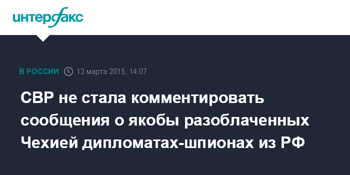 Москва. 12 марта. INTERFAX.RU - В Службе внешней разведки (СВР) РФ воздержались от комментариев по поводу утверждений чешских СМИ о том, что три российских дипломата в Праге якобы занимались разведдеятельностью.