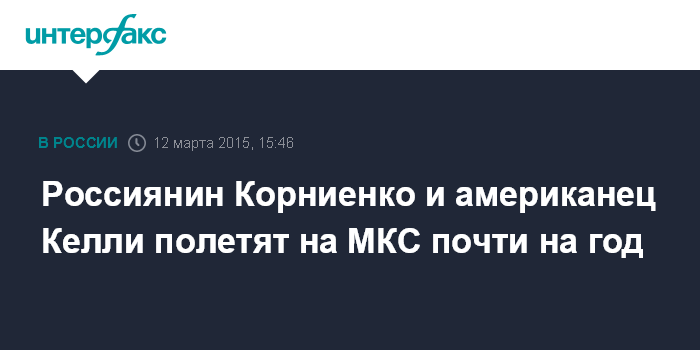 Москва. 12 марта. INTERFAX.RU - Космический полет россиянина Михаила Корниенко и американца Скота Келли продлится с 27 марта 2015 года по 3 марта 2016 года, сообщил в четверг замгенконструктора РКК "Энергия", руководитель полета российского сегмента МКС Владимир Соловьев.