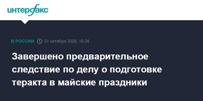 Москва. 31 октября. INTERFAX.RU - Предварительное следствие по делу о подготовке теракта на майские праздники в 2007 г. завершено. В декабре, как ожидается, оно будет передано в суд, сообщил "Интерфаксу" адвокат одного из обвиняемых.