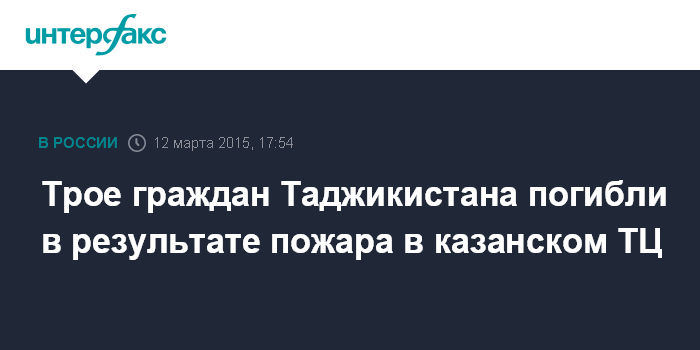 Москва. 12 марта. INTERFAX.RU - Среди погибших в результате пожара в торговом комплексе "Адмирал" в Казани есть трое граждан Таджикистана, сообщил агентству "Интерфакс-Поволжье" в четверг пресс-секретарь УФМС России по Татарстану Алексей Пашин.
