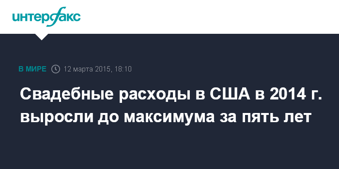 Москва. 12 марта. INTERFAX.RU - Свадебные расходы в США в 2014 году увеличились до максимального показателя за пять лет, сообщает агентство Bloomberg.