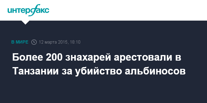 Москва. 12 марта. INTERFAX.RU - Более 200 знахарей и народных целителей были арестованы в Танзании по подозрению в причастности к убийствам альбиносов, сообщает BBC.