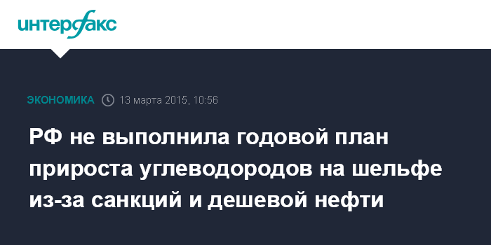 Москва. 13 марта. INTERFAX.RU – Прирост запасов углеводородного сырья на шельфе в 2014 году, по предварительным данным, составил 182 млн тонн условного топлива при плане в 392 млн тонн, в то время как в 2013 году этот показатель был зафиксирован в объеме 557 млн тонн.