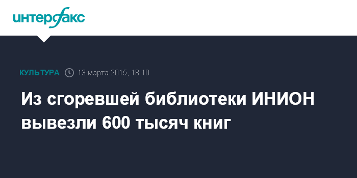 Москва. 13 марта. INTERFAX.RU - Более 600 тысяч экземпляров книг эвакуированы из горевшего Института научной информации по общественным наукам (ИНИОН РАН), сообщает пресс-служба ФАНО России.