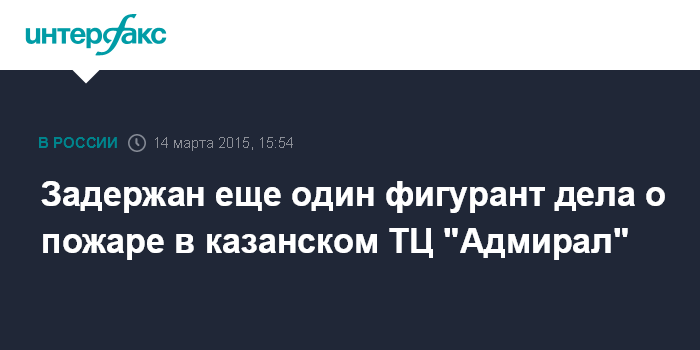 Москва. 14 марта. INTERFAX.RU - Следствие задержало в субботу Николая Каекина - замгендиректора по технике безопасности ООО "Заря", которое являлось арендатором сгоревшего в минувшую среду казанского ТЦ "Адмирал".
