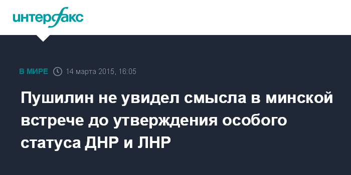 Москва. 14 марта. INTERFAX.RU - Полпред самопровозглашенной Донецкой народной республики на Минских переговорах Денис Пушилин заявил, что не видит смысла во встрече Контактной группы до утверждения Верховной радой особого статуса Донбасса.