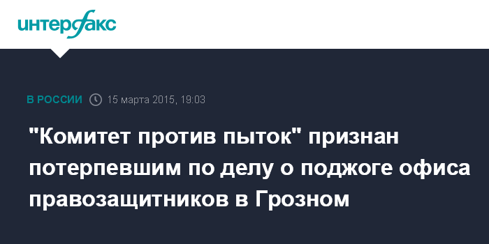 Москва. 15 марта. INTERFAX.RU - "Комитет против пыток" (межрегиональная общественная организация, Нижний Новгород) признан потерпевшим по уголовному делу о поджоге офиса Сводной мобильной группы (СМГ) в Грозном, сообщается в воскресенье на сайте правозащитной организации.