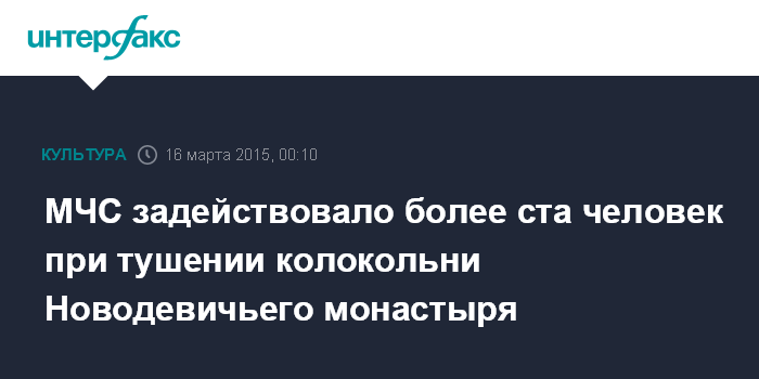 Москва. 16 марта. INTERFAX.RU - Более ста пожарных принимают участие в борьбе с огнем на колокольне Новодевичьего монастыря, сообщили "Интерфаксу" в пресс-службе ГУ МЧС России по Москве.