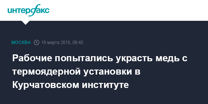 По его данным, с 3 по 13 марта двое рабочих, граждан Молдавии, сняли с экспериментальной термоядерной установки "Токамак Т-15" в Научно-исследовательском центре "Курчатовский институт" медные шины.
