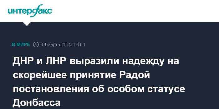 Москва. 16 марта. INTERFAX.RU - В ДНР и ЛНР настаивают на скорейшем принятии Верховной радой Украины постановления об определении отдельных районов Донбасса с особым порядком местного самоуправления.