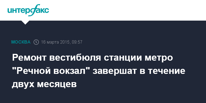 Москва. 16 марта. INTERFAX.RU - Реконструкция северного вестибюля станции "Речной вокзал" Замоскворецкой линии Московского метрополитена будет завершена в течение двух месяцев.