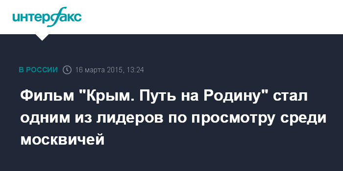 Москва. 16 марта. INTERFAX.RU - Документальный фильм "Крым. Путь на Родину", показанный накануне на телеканале "Россия 1", собрал у экранов более 40% взрослых москвичей.