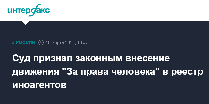 Москва. 16 марта. INTERFAX.RU - Замоскворецкий суд Москвы признал законным внесение одной из крупнейших российских неправительственных организаций - движения "За права человека" в реестр НКО-"иноагентов".
