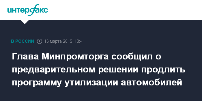 Москва. 16 марта. INTERFAX.RU - Государство приняло предварительное решение о продлении программы утилизации автомобилей, сообщил министр промышленности и торговли Денис Мантуров в ходе брифинга в понедельник в Тихвине.