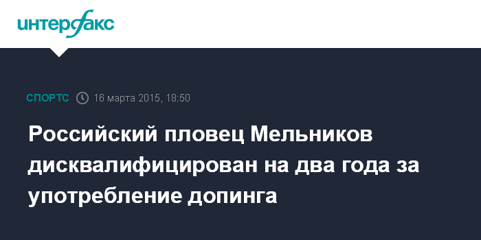 Москва. 16 марта. INTERFAX.RU - Россиянин Виталий Мельников дисквалифицирован на два года за употребление запрещенных препаратов, сообщает официальный сайт Международной федерации плавания.