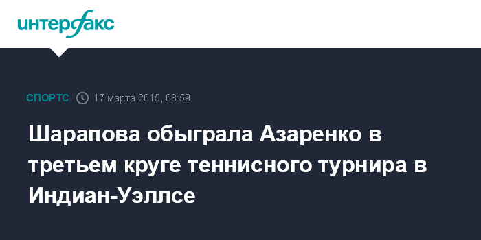 Москва. 17 марта. INTERFAX.RU - Россиянка Мария Шарапова в двух сетах одолела Викторию Азаренко из Белоруссии в матче третьего круга теннисного турнира WTA BNP Paribas Open в американском Индиан-Уэллсе.