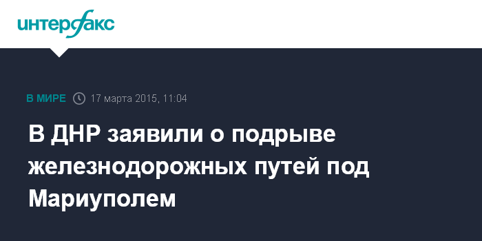 Москва. 17 марта. INTERFAX.RU - Власти самопровозглашенной Донецкой Народной Республики сообщили о подрыве утром во вторник железнодорожных путей около Мариуполя и возложили ответственность за это на украинских военных.